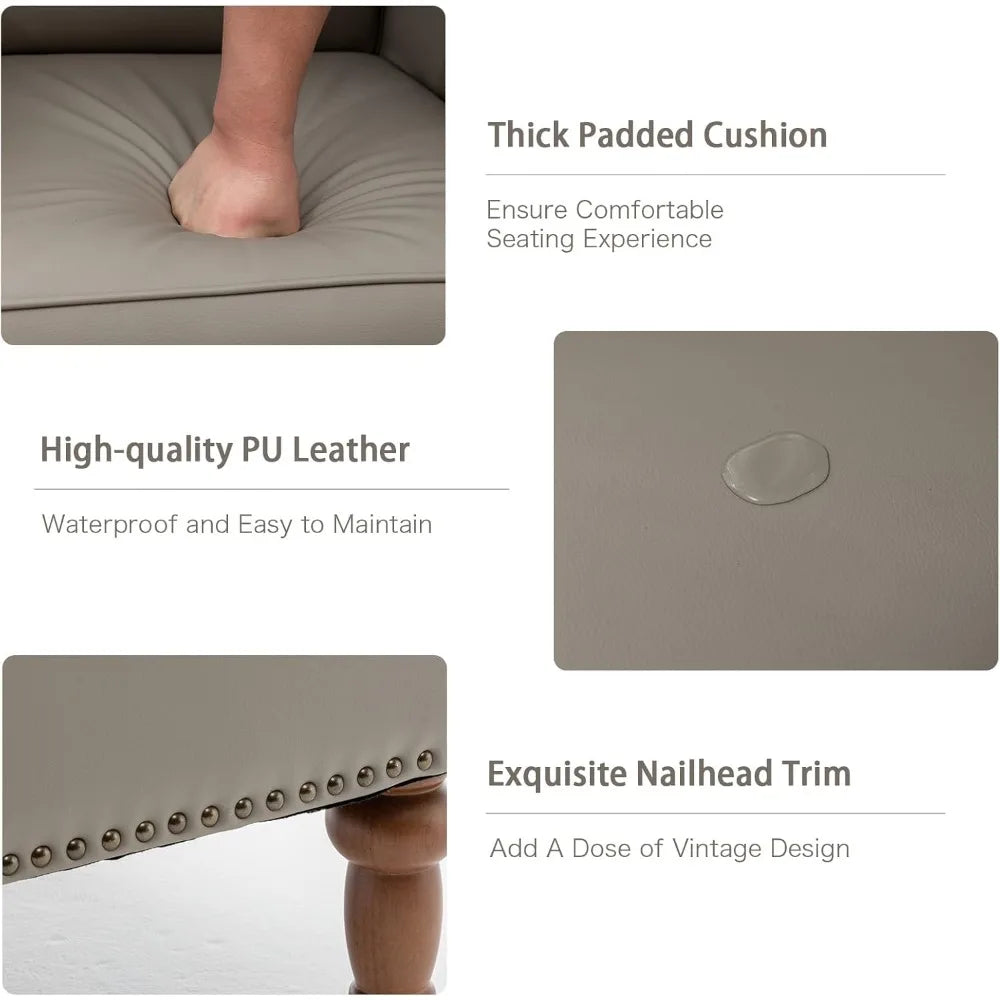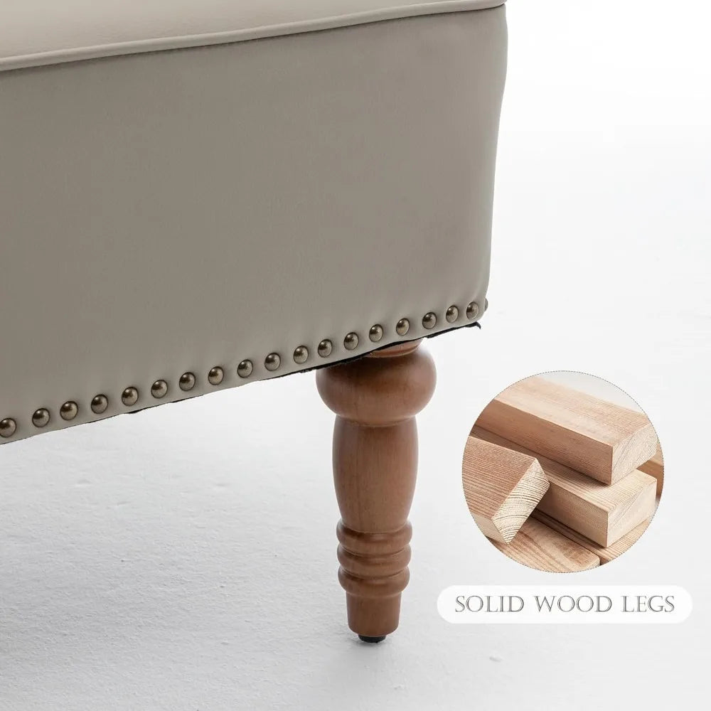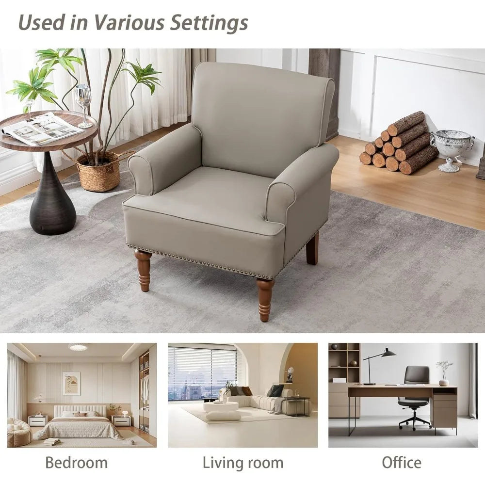 Upgrade your home with this Mid-Century Accent Chair, crafted with faux leather upholstery, elegant nailhead trim, and solid wood legs. The clean silhouette and retro-inspired design make it a versatile choice for both living rooms and bedrooms.