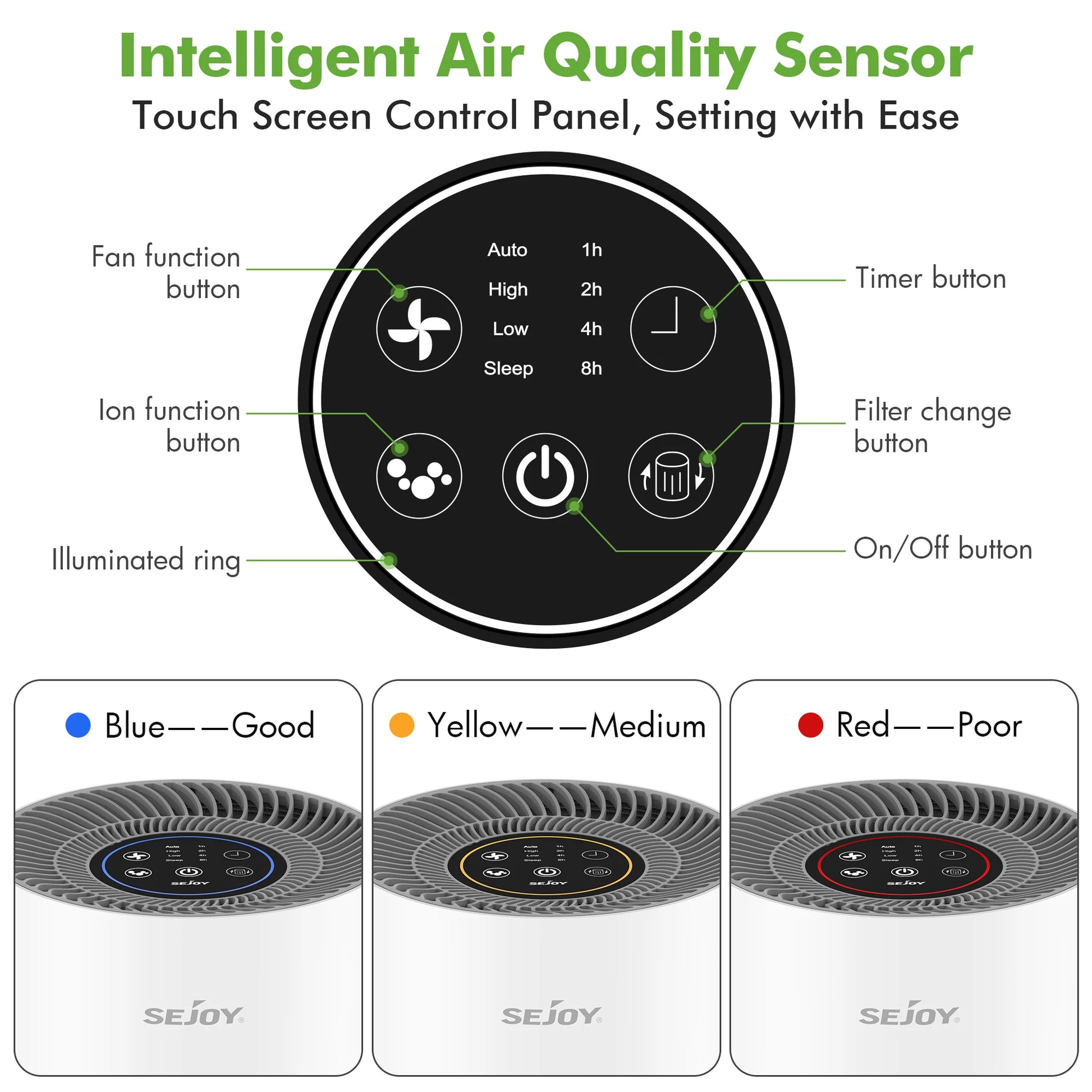 Choose from 4 adjustable fan speeds and set the built-in timer for energy-saving convenience. The True HEPA filter works alongside the ionizer & cold plasma technology to neutralize allergens, bacteria, and even stubborn odors, ensuring you always enjoy crisp, purified air. Its quiet operation makes it perfect for restful sleep and daily use.